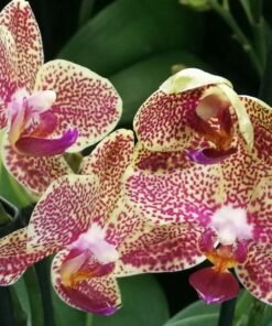 This moth orchid has dark red spots spread over its yellow petals. They often blooms in long spikes with a large number of flowers. Easy to take care orchid plant.