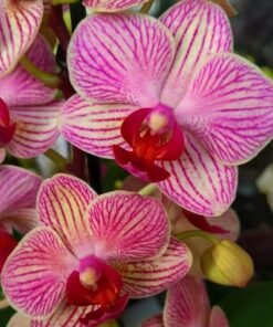 This phalaenopsis has pink stripe flowers with a dark red lip. They are frequent bloomers and an easy to care hybrid that can be grown indoor as well as outdoor.