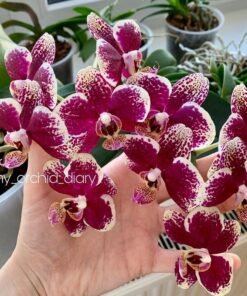 This phalaenopsis has dark burgundy flowers with yellow mixed patterns. They often blooms in long spikes with a large number of flowers. Easy to take care orchid plant.