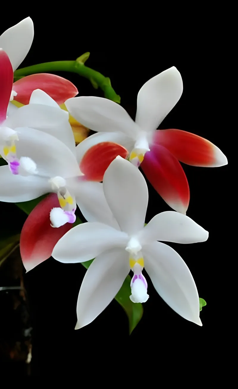 Phalaenopsis Tetraspis Red is a sought-after species orchid prized for its artistic, unpredictable color patterns. Its elegant star-shaped flowers emerge in creamy white tones accented by vivid red markings that vary from bloom to bloom. No two flowers are ever exactly the same, adding exceptional collector value.