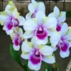 Lush, pendant clusters with soft peach petals and a glowing orange lip