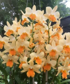 Lush, pendant clusters with soft peach petals and a glowing orange lip