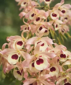 The Dendrobium Meen Honey Drop Orchid is a delicate and elegant hybrid admired for its soft pink flowers and distinctive creamy lip. The blooms feature slender petals in gentle pink tones, paired with a rounded creamy-white center highlighted by a deep magenta throat.