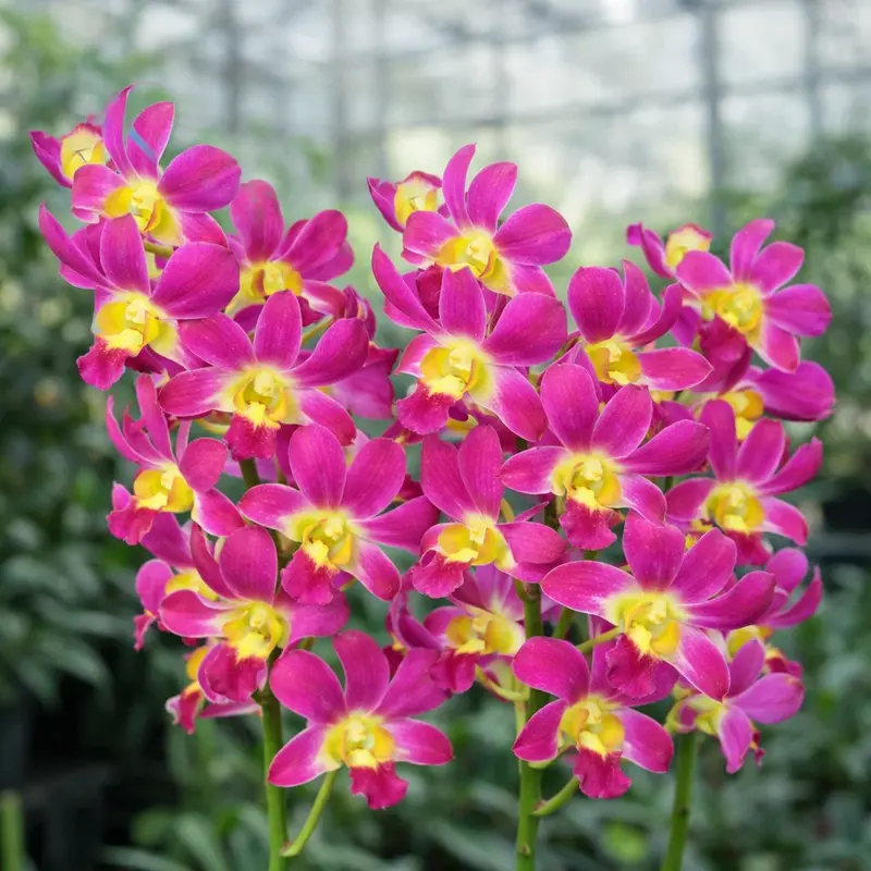 A colorful dendrobium hybrid ideal for decorative orchid collections.
