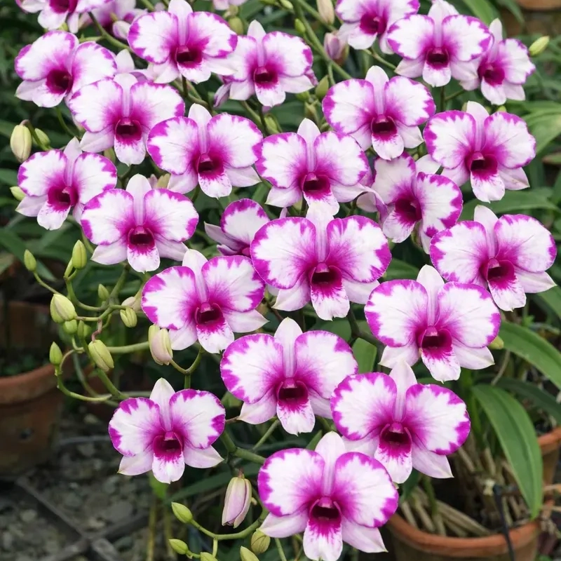 Dendrobium Prakai Kanya is a delightful orchid prized for its elegant contrast of pure white petals highlighted by rich violet-purple throats. The blooms appear in clusters along upright canes, creating a graceful and eye-catching display that suits both modern interiors and orchid collections.