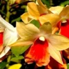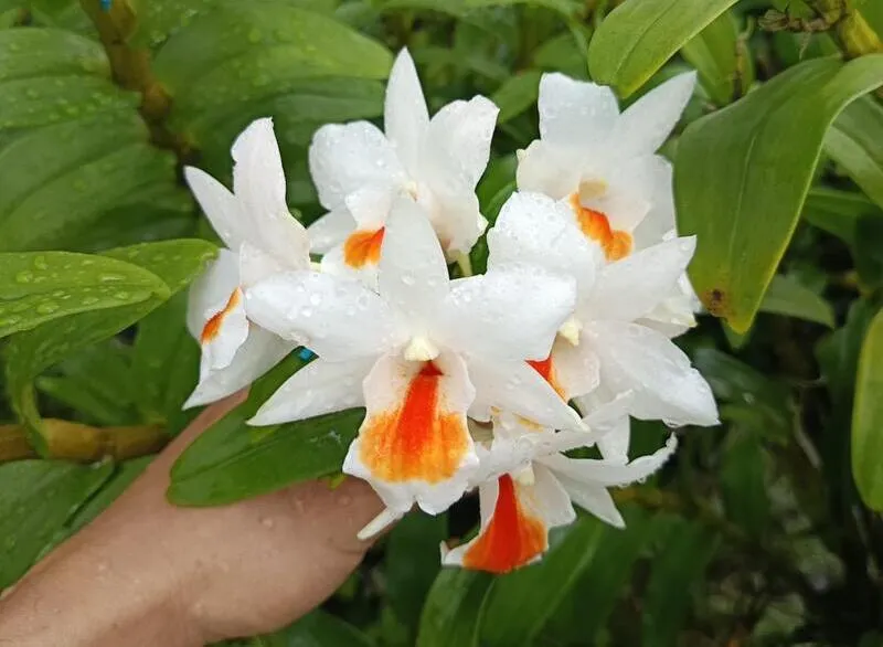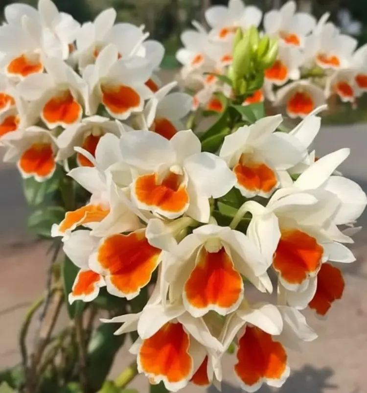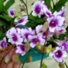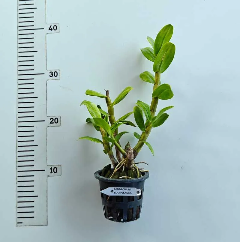 Dendrobium Roong Kamol is a highly attractive orchid prized for its clean white petals contrasted by a bright orange throat. The blooms appear in clusters along the canes, creating a graceful and eye-catching presentation. This ready-to-flower size plant is well-established and capable of blooming soon under proper care, making it an excellent choice for collectors and orchid enthusiasts alike. Its refined color combination makes it suitable for both display collections and gifting.