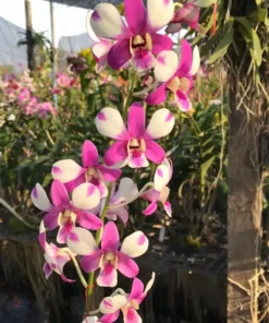 Dendrobium Shavin Pink is a dazzling orchid hybrid that captures attention with its vibrant two-tone blooms. The flowers feature creamy-white petals splashed with vivid magenta-pink, creating a striking contrast that glows beautifully in sunlight. The bold magenta lip, touched with delicate patterns, adds an extra layer of charm.