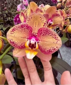 Introduce a dramatic splash of colour with Phalaenopsis PP078. This standout moth orchid produces broad, rounded blooms in a warm peach-apricot tone, richly freckled with magenta toward the petals and wings. At the centre, a glowing yellow throat and glossy lip add depth and contrast, making every spike look hand-painted. Raised in controlled greenhouse conditions, PP078 arrives vigorous, clean, and ready to display—ideal for gifts or interior styling.