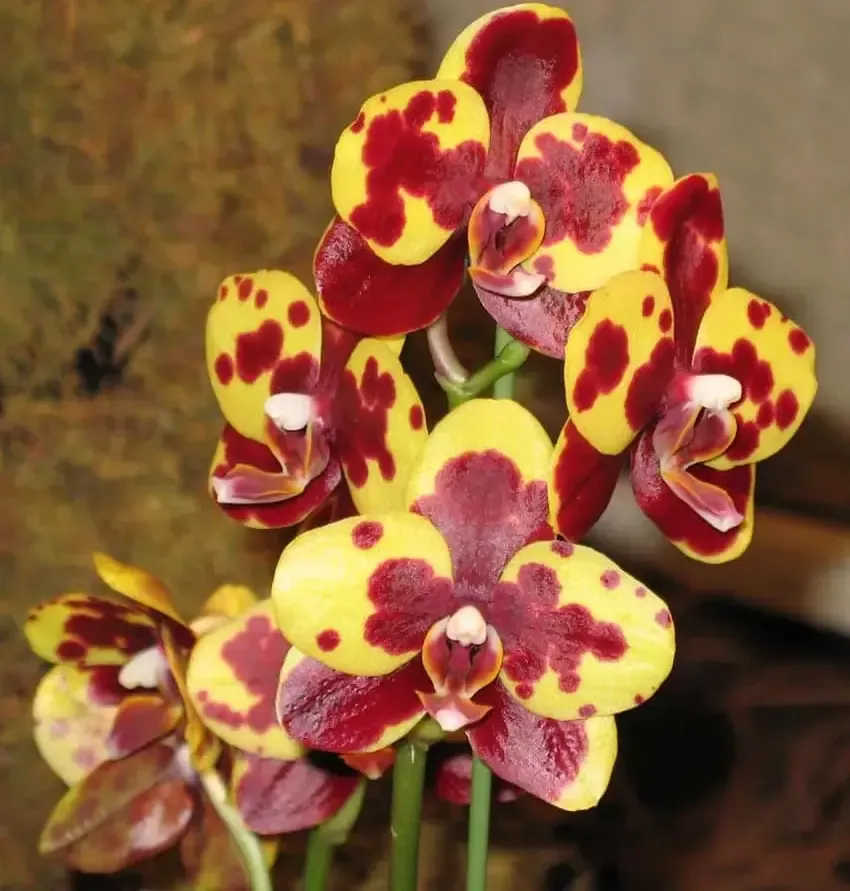 Phalaenopsis PP109 is a showstopper: sunny yellow flowers dramatically splashed with burgundy and finished with a glossy lip—high impact, low effort.