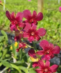 Each flower displays smooth, well-balanced petals arranged along slender stems, producing a graceful cluster of blossoms. The deep red color gives the plant a dramatic presence, making it a beautiful highlight in any orchid collection.