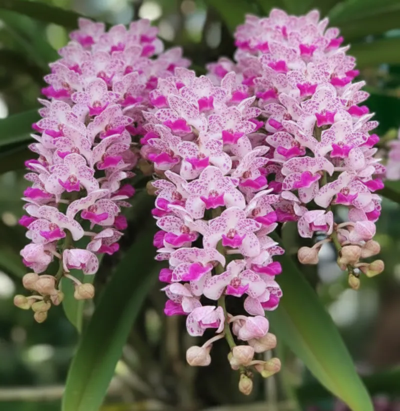 This foxtail blooming orchid is known for its pink shaded flowers with dark red patterns.