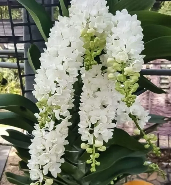Rhynchostylis White Foxtail (Medium Size) is a classic and highly sought-after orchid known for its pure white, densely packed foxtail flower spikes. The blooms form thick, cascading clusters with excellent symmetry and a clean, elegant appearance that stands out in any orchid collection.