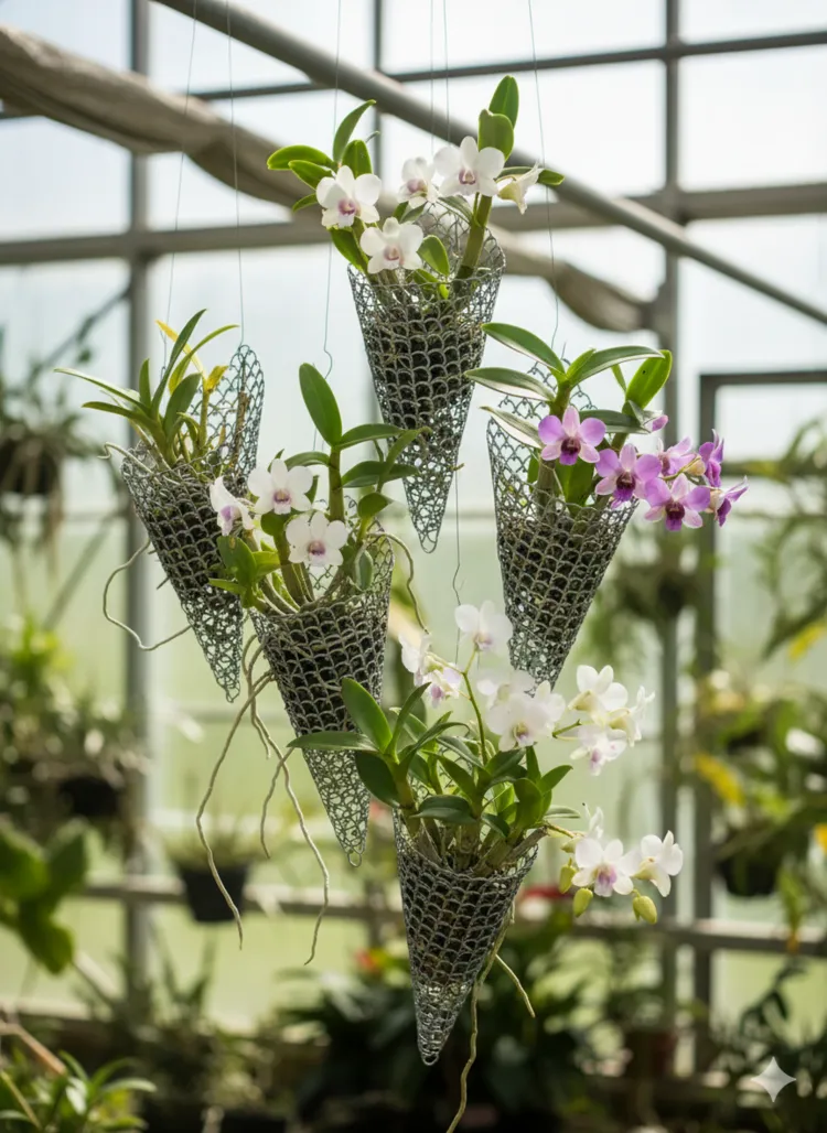 Lightweight grey cone net planters that keep roots airy and happy. Pack of 10—perfect for orchids and other epiphytes. Durable, fast-draining, easy to hang.