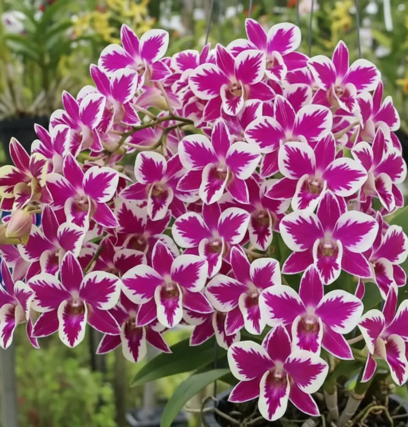Splash 5% 64 is a premium orchid seedling celebrated for its dramatic splash-patterned blooms. The flowers display rich magenta-purple petals edged and splashed with creamy yellow, creating a bold, high-contrast look that immediately stands out. With multiple upright spikes and dense flower arrangements when mature, this variety is highly valued by collectors and show growers alike.