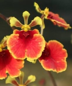 This tolumnia orchid has dark red flowers with yellow shade background on each petals and yellow small petals on each flowers with beautiful red patterns.