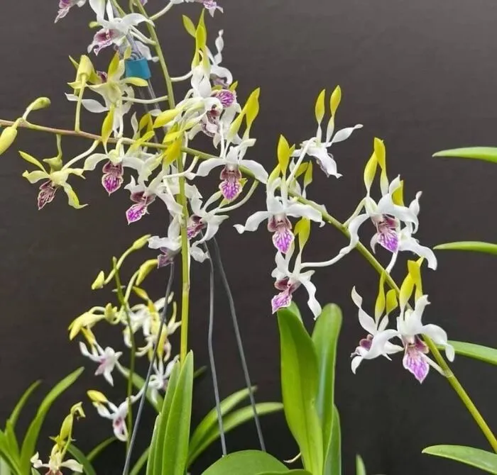 Each flowering stem produces multiple blooms arranged along long arching spikes, creating a stunning cascading display. The soft green tips and white petals contrast beautifully with the intricate purple markings at the center.