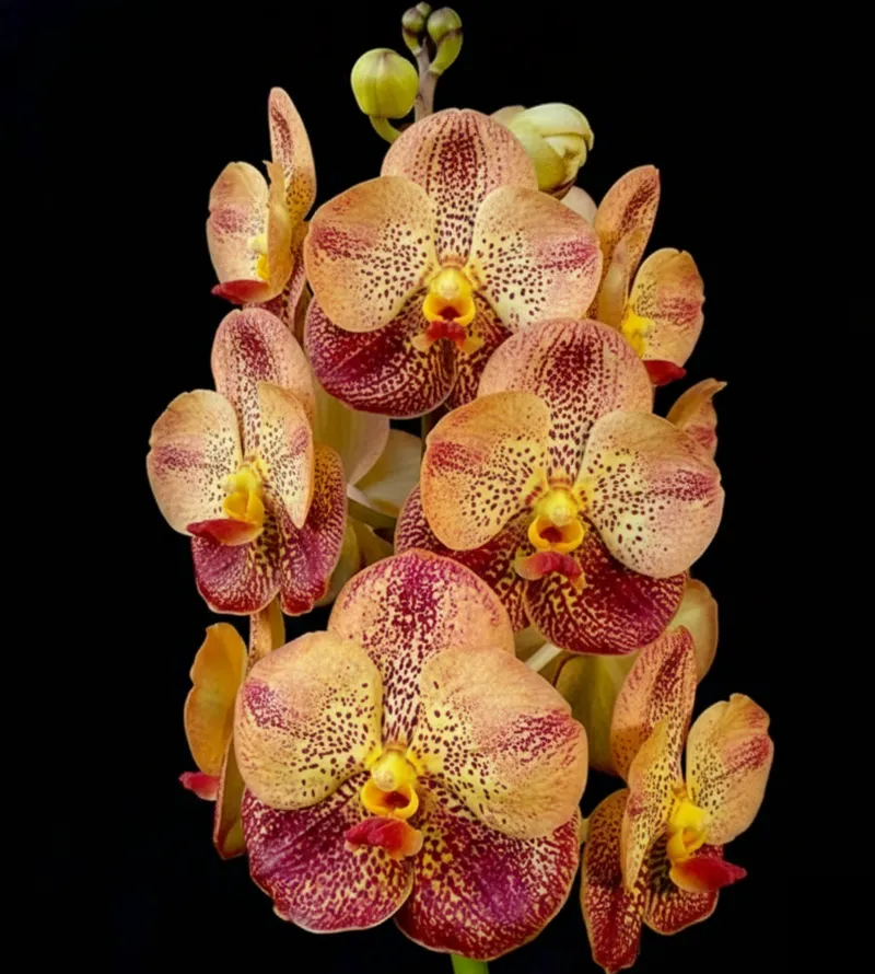 Vanda Brown Spot 9 is an eye-catching blooming-size orchid admired for its dramatic contrast of warm yellow tones and dense brown speckling. The flowers are large, round, and well-formed, arranged in a full spike that creates an impressive visual impact. This variety is ideal for orchid enthusiasts seeking unique color patterns and strong floral presence. Supplied at blooming size, it is ready to reward growers with stunning flowers under proper care.