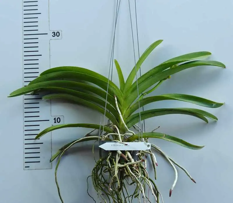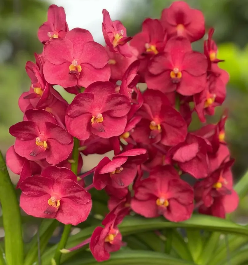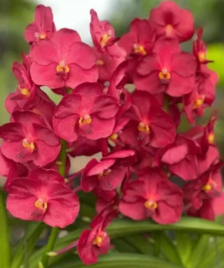 Meet Vanda Dr. Anek × Wilas, a showy hybrid prized for its bold, velvety red blooms and reliable performance in warm, bright conditions. The plants develop sturdy leaves and strong aerial roots that take to baskets or net pots beautifully—great for patios, balconies, and bright windows.