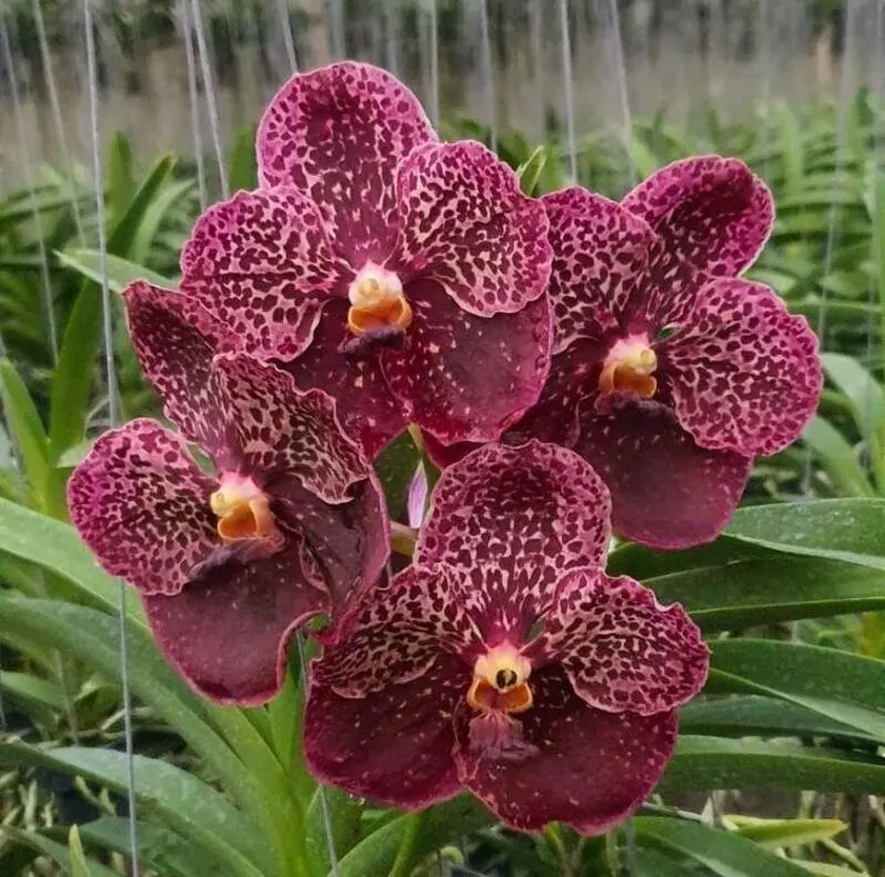 This orchid produces clusters of large, long-lasting flowers on upright spikes, typical of Vanda hybrids. The rich color and intricate texture make it a standout addition to any orchid collection.