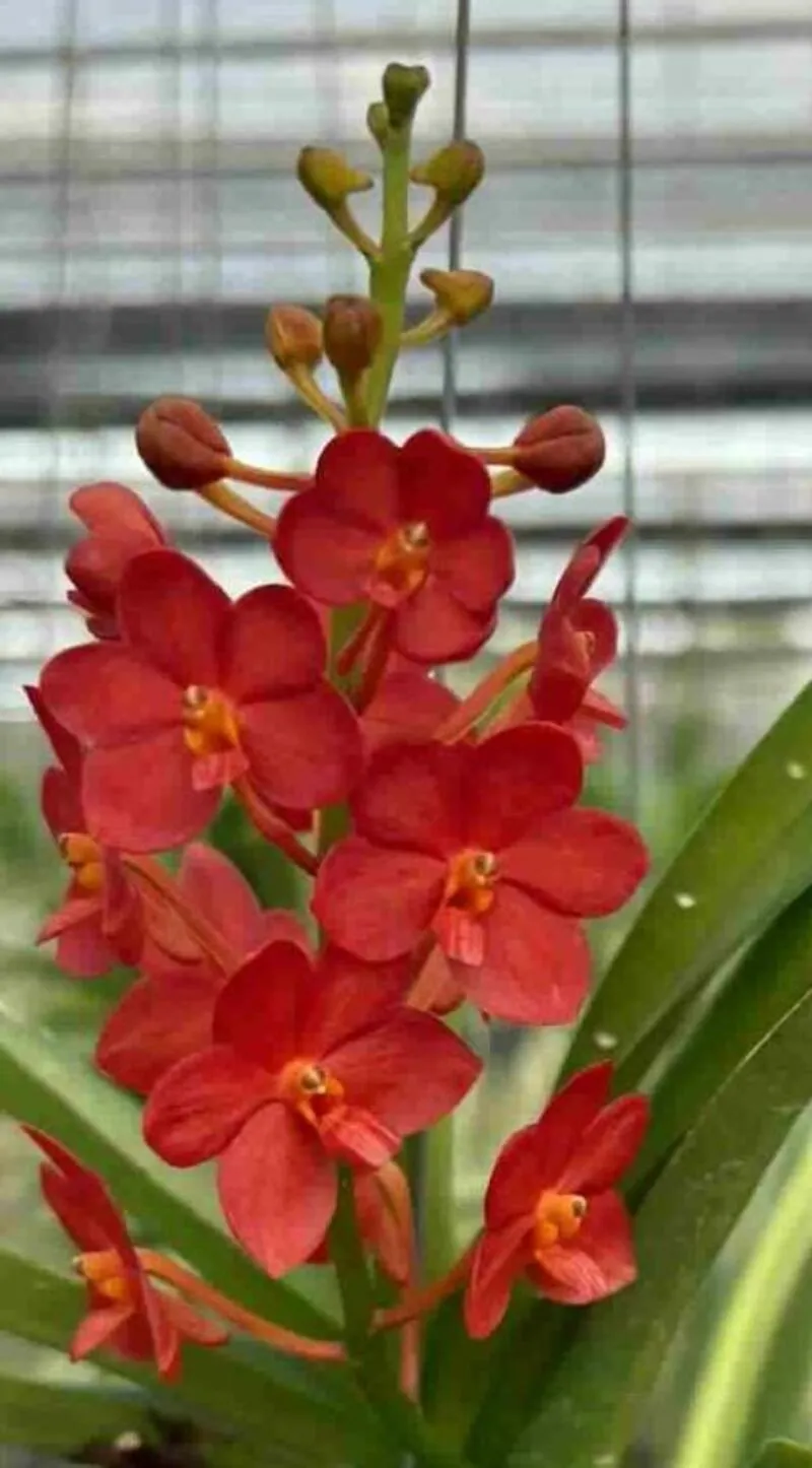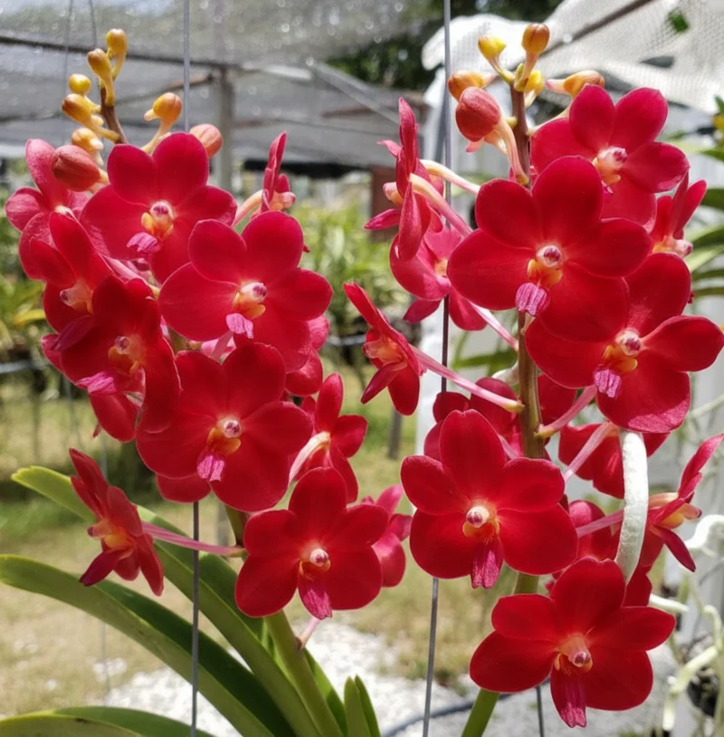 Vanda Lak Si is a premium blooming-size Vanda orchid admired for its rich red flowers and elegant upright flower spikes. Each bloom displays a smooth, rounded form with a warm orange-red center, creating a vivid and eye-catching display. This variety is well known for its strong flowering habit and consistent performance, making it an excellent choice for both collectors and ornamental displays.