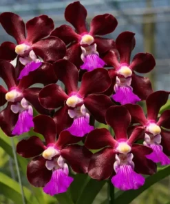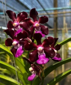 The Vanda Merrillii × Paksorn Fragrance – Blooming Size is a remarkable orchid hybrid prized for its rich dark-colored blooms and sweet fragrance. The flowers display deep burgundy to maroon petals complemented by a vibrant pink lip, creating a striking tropical contrast.