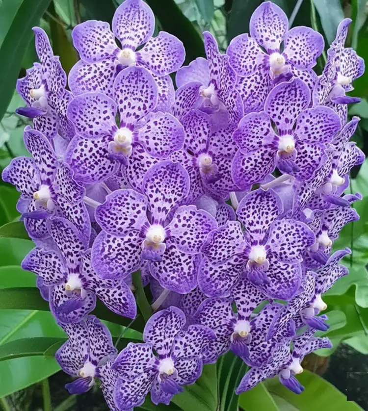 Vanda Omar Padron is a highly desirable hybrid orchid admired for its large, round flowers in rich lavender to violet tones, densely patterned with deep purple spotting. The blooms have excellent substance and symmetry, creating a bold and luxurious floral display.