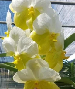 The Vanda Ranu Gold x Noppon Gold Orchid is a beautiful hybrid orchid known for its elegant combination of creamy white petals and vibrant golden-yellow lips. This blooming-size plant produces clusters of large, bright flowers that create a striking tropical display.