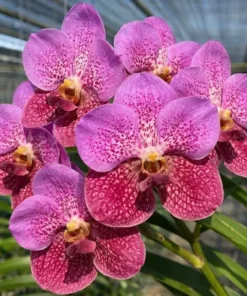 The Vanda Reno Delight × Bltz – Blooming Size is a striking hybrid orchid admired for its vibrant pink blooms covered in beautiful speckled patterns. Each flower displays rich pink petals decorated with darker spots and delicate shading, creating a lively and eye-catching appearance.