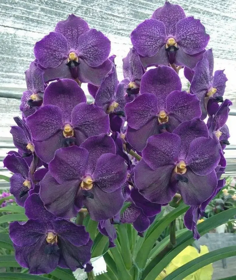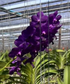This orchid produces clusters of large flowers arranged along tall flower spikes, forming a stunning cascade of vibrant color. The bold purple tones make this Vanda hybrid a standout specimen in any orchid collection or tropical display.