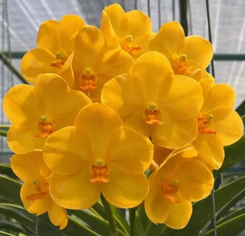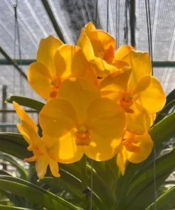 This Vanda orchid produces clusters of bright flowers on upright spikes, forming an impressive display of tropical color. The luminous yellow-orange tones resemble warm sunlight, making this orchid especially eye-catching in greenhouses, patios, and orchid gardens.