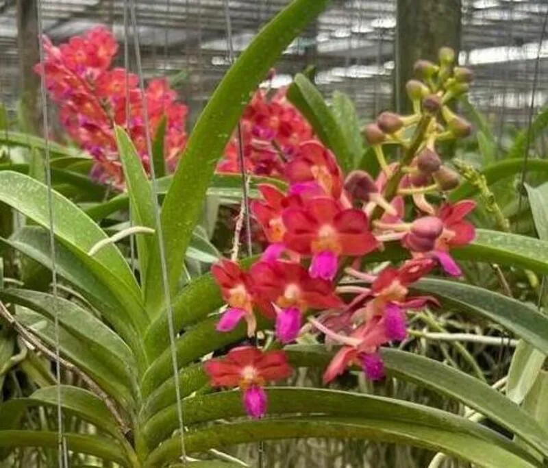 Vanda Wilas × Bangkok is a premium hybrid orchid admired for its dense clusters of warm red to orange flowers accented by vivid purple-pink lips. The blooms are medium to large in size and arranged neatly along upright spikes, creating an eye-catching display.