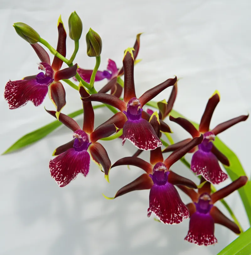 Zygopetalum Louisendorf is a striking hybrid orchid admired for its rich burgundy to chocolate-toned petals contrasted by a vibrant purple lip with fine markings. The bold coloration and distinctive flower shape give this orchid a refined yet dramatic appearance.